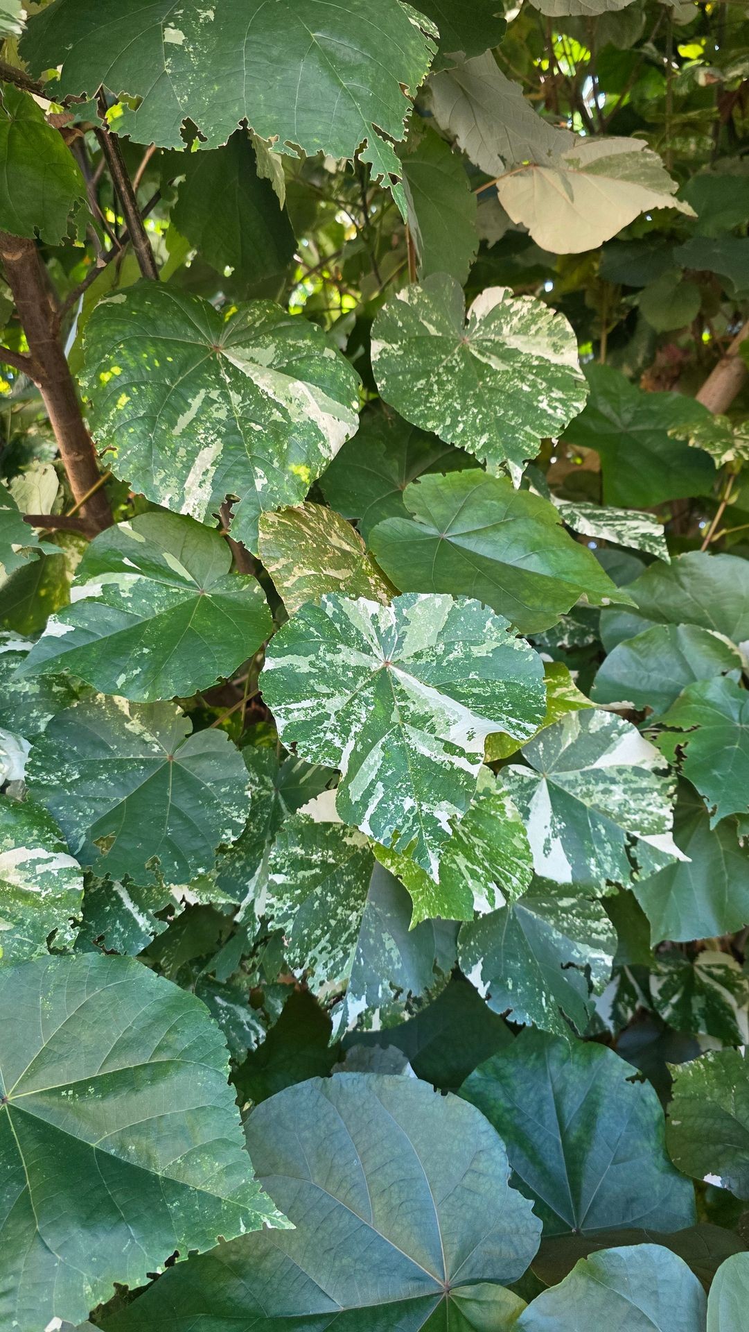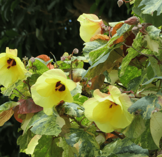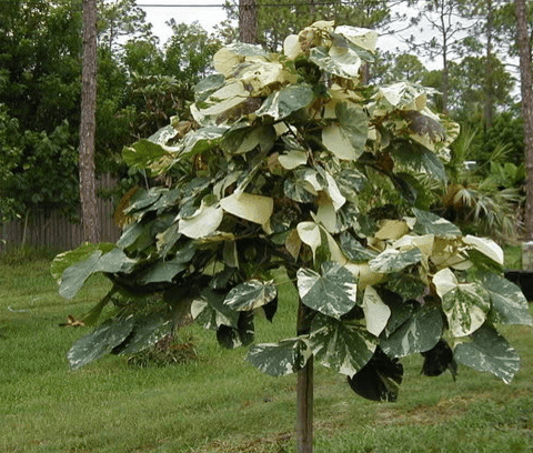 Variegated Mahoe is an ornamental tropical tree or large shrub known for its heart-shaped leaves with a tri-color pattern of green, cream, and burgundy, and for its yellow flowers that turn reddish as they age. It is a fast-growing, salt-tolerant plant, often used in coastal gardens and thrives in full sun in USDA hardiness zones 9 through 11.